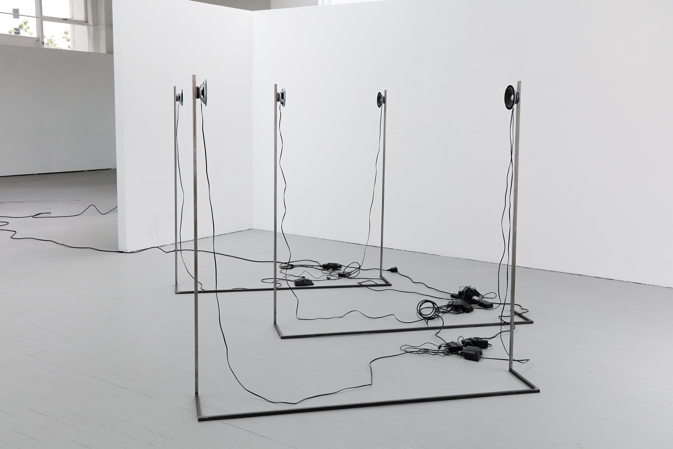 2021. 6-channel sound installation (20mins duration): 3 steel stands, 6 cone speakers, 3 amplifiers, 3 media players, 3 USB flash drives containing 3x 2-channel audio files, power adapters and electrical cabling. Each stand 1700mm x 300mm x 1600mm, overall dimensions variable.