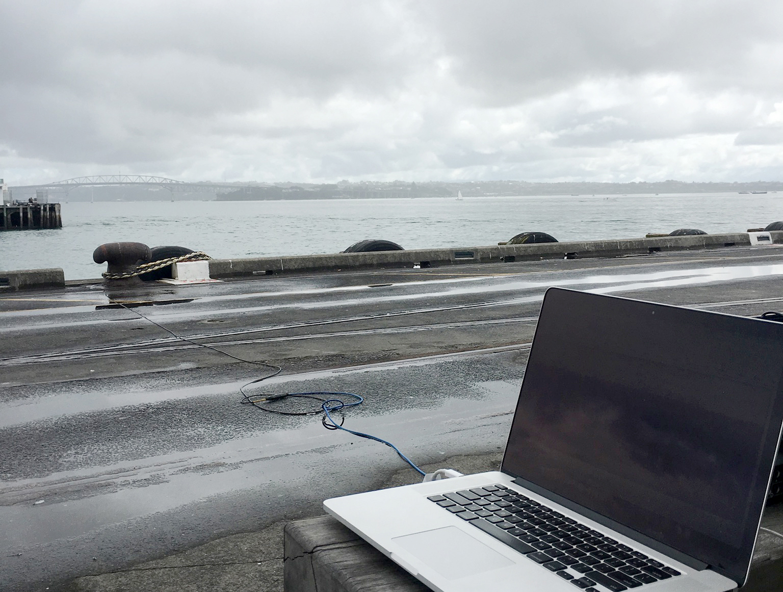 Sound recordings made using a hydrophone lowered into water from Queens wharf, taken during the day and at night. A large drawing on canvas was then produced based on this listening experience, and sections of the drawing then converted to sound using software. The audio piece is made up of the underwater recordings and drawing segments. Sound art pioneer Pauline Oliveros’ ‘deep listening’ concept was referenced in this process.